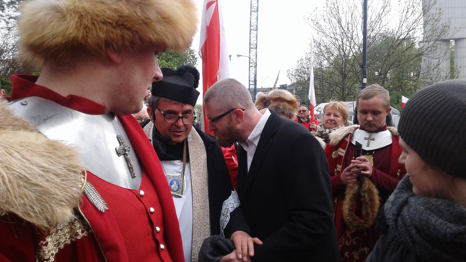 kandydat na prezydenta Polski, Grzegorz Braun i ksiądz profesor Piotr Maria Natanek. Spotkali się już po ogłoszeniu końca manifestacji.